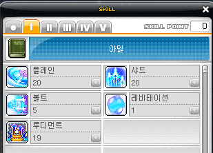 플레인과 샤드가 공격기이니 두 스킬을 먼저 1씩 찍고, 이동키를 마스터한 뒤에 그 다음 루디먼트를 마스터합니다. 참고로 대부분의 메이플 스킬트리는 이렇게 공격력 스킬을 1씩만 찍고 패시브를 마스터합니다. 그 이유는 패시브를 먼저 마스터하면 앞서 1씩 찍은 공격력 스킬이 강해지기 때문입니다.
