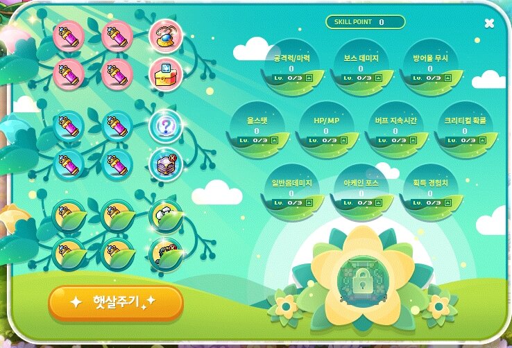 그리고 메이플 햇살주기를 할때마다 스킬포인트를 얻을 수 있어요. 매 주 1,2회차에는 1 스킬포인트를, 그리고 3회차에는 3 스킬포인트를 획득하실수 있습니다.