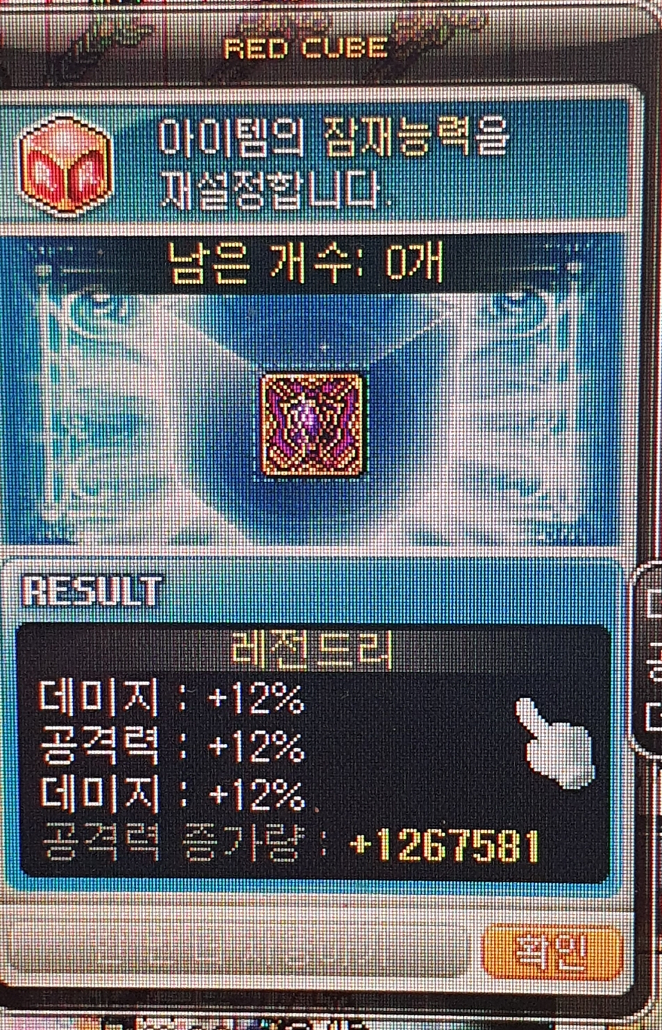 그래도 보스전에서 뎀3퍼가 공1퍼정도 효율이 난다고 합니다! 조금 아쉽지만 무료 큐브로 얻은 옵션이니 만족!!