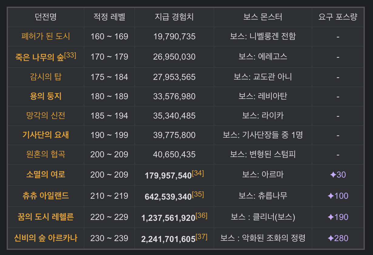 각 던전에서 얻을수 있는 경험치량을 아래서 알려드릴게요!