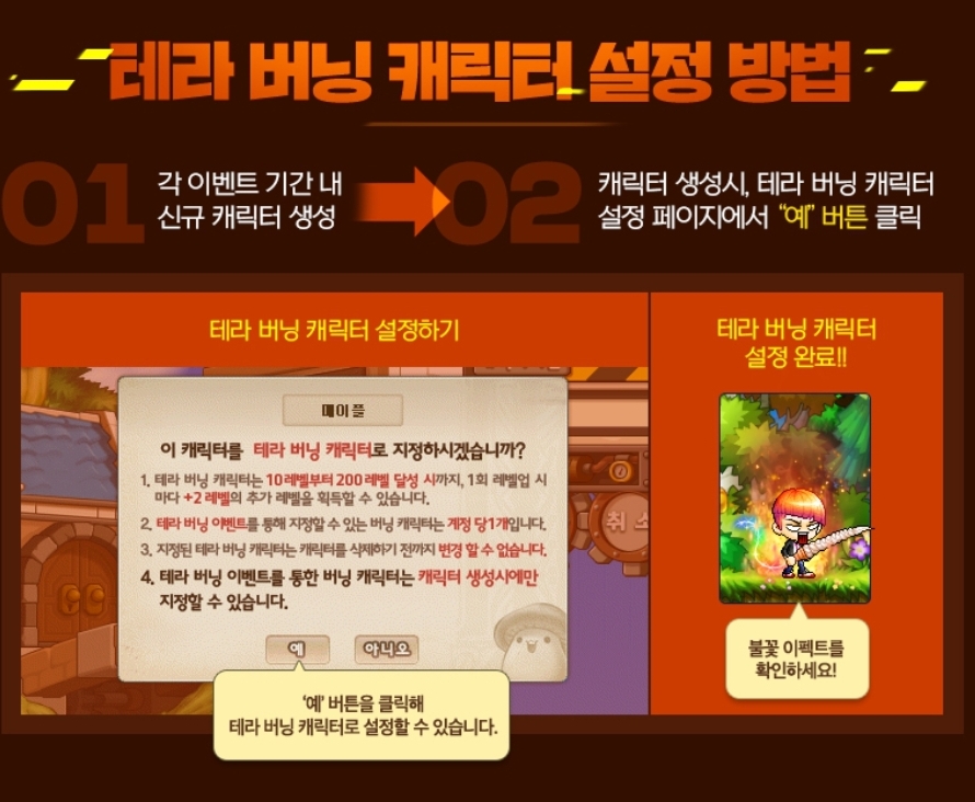 테라버닝 캐릭터 설정 방법은 아래 사진 참고해주세요. 캐릭터 밑에 불꽃 모양이 생기면 테라버닝 효과를 받고있다는 뜻입니다.