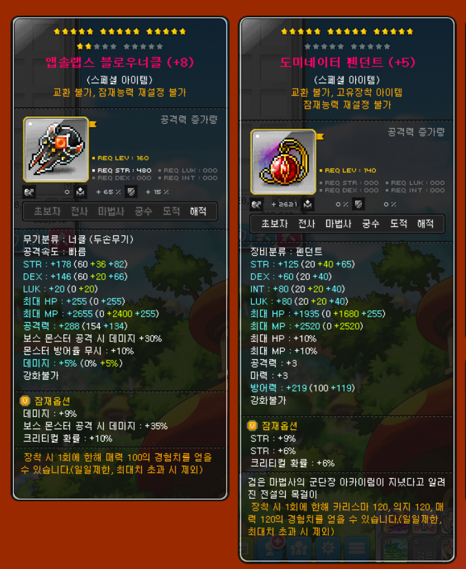 - 상자에서 획득한 앱솔과 도미는 영구아이템이며, 추옵 재설정 빼고 옵션을 건드릴 수 없습니다.