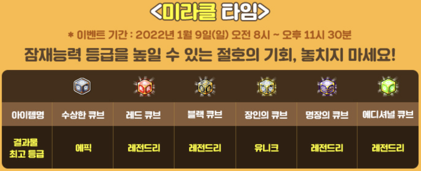 큐브 잠재능력 등급 상승 확률이 증가하는 이벤트입니다. 렏큡, 블큐 뿐만 아니라, 이벤트에서 획득 가능한 이벤ㄹ이큐브, 카르마장큡 등도 모두 확률이 증가해요. 구체적인 확률은 아래 표를 참고해주세요.