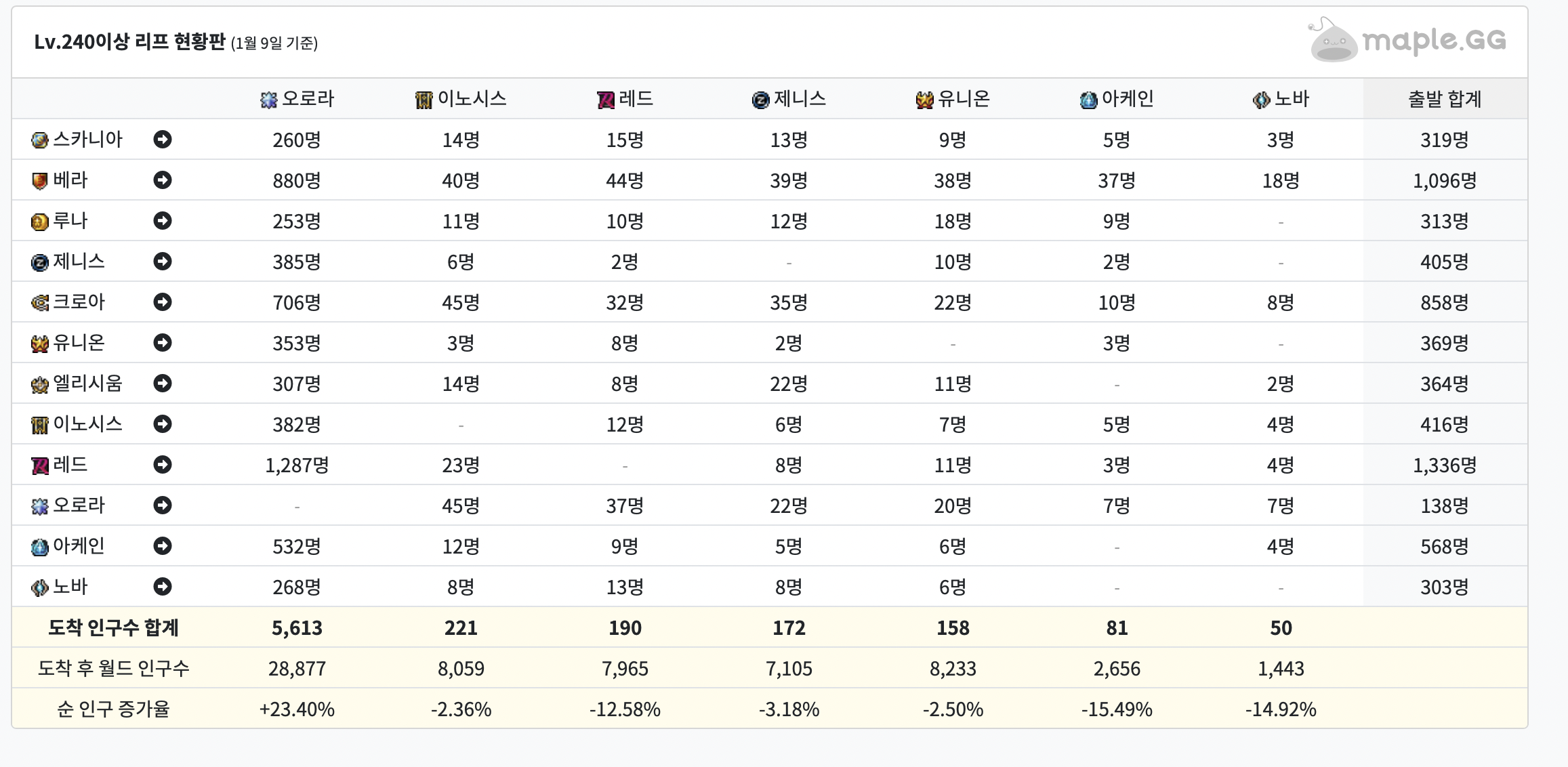 240렙 이상 리프 현황을 보면, 본캐로 추정되는 캐릭터드리이 대부분 오로라로 옮겨갔다는 걸 알 수 있습니다.